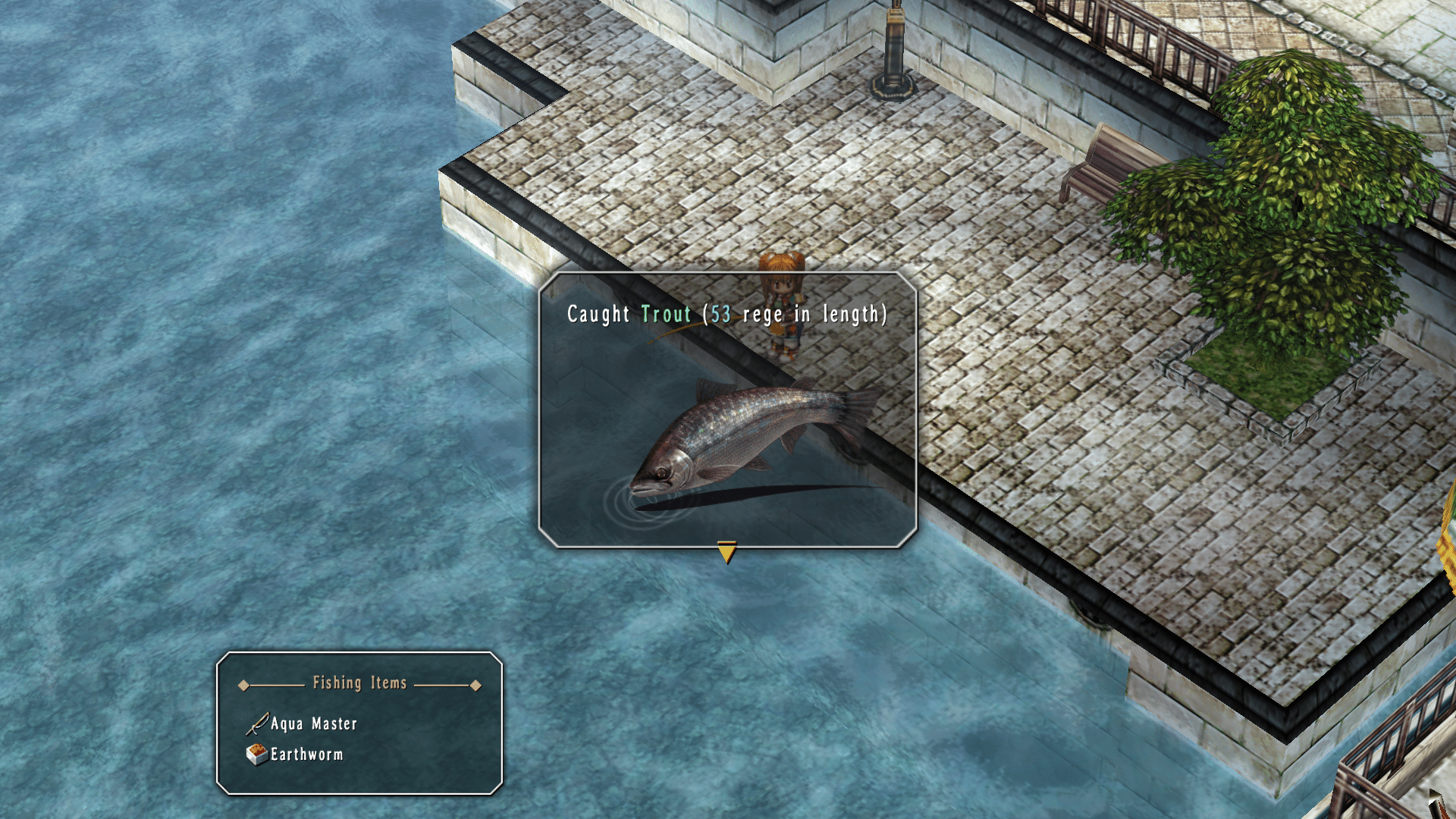 Trails in the Sky SC | FishingWhile the main plot is quite extensive, the way to discover much of the world is through talking to people, buying information books at the shops, and taking on side quests. The quests are still as simple as finding them at the guild board, completing the tasks and reporting back for money and items. The quest types, like tracking down hidden bosses and going on a scavenger hunt with cryptic clues, should be familiar. However, some also include the new addition of fishing to the game. It’s an extremely basic and not-very-interesting version of the classic RPG minigame, but considering Estelle’s interest in fishing, at least it makes sense.