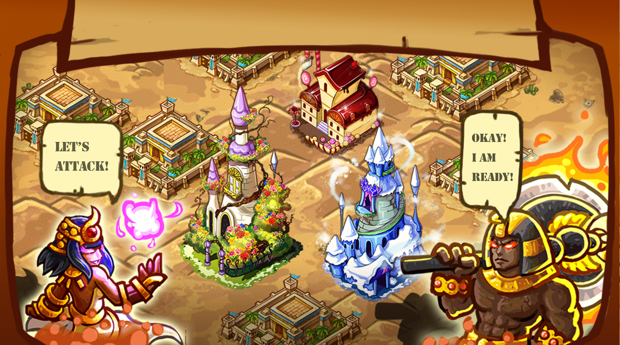 Kingdom Siege is a strategy game taking place in an Egyptian-themed fantasy world. The game boasts many cool features like building structures, training soldiers, researching mystical technologies and more.