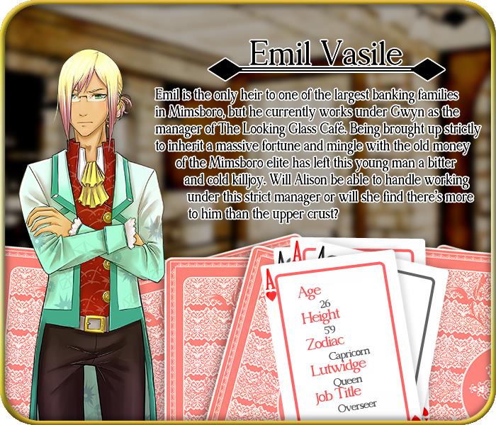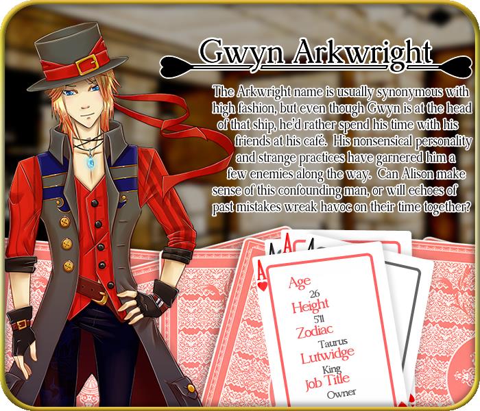 Confused, Alison sets out to discover more about her new surroundings. When she meets a few unsavory sorts, she flees through the unfamiliar town, escaping onto the breathtaking Arkwright estate… where she trips the security system and knocks herself unconscious. Luckily, she’s found by the mansion’s kind owner, Gwyn Arkwright, who takes care of her wounds, listens to her tale, and offers Alison a job at his café, The Looking Glass. With this world being so different from Earth, Alison sees very few alternatives and accepts Gwyn’s offer. Everything’s peachy except… now Alison must choose which of The Looking Glass’ five café employees will train her!