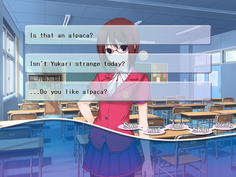Calling the humor in this game tongue-in-cheek would be the understatement of the century. Most of the humor derives from watching an alpaca trying to do normal, everyday high school things. The story starts out really lighthearted but slowly evolves into a fairly deep plot for a game with a silly premise like this. It’s nothing too groundbreaking, but it is definitely thought provoking enough to keep you interested. This really shouldn’t have caught me off guard, but it did, and that’s what a good game should do. The deeper meaning shifts with the four different routes, and that’s a nice touch. I found every route to be enjoyable, and the entire plot as a whole to be really nice. It kept me interested the entire way through.