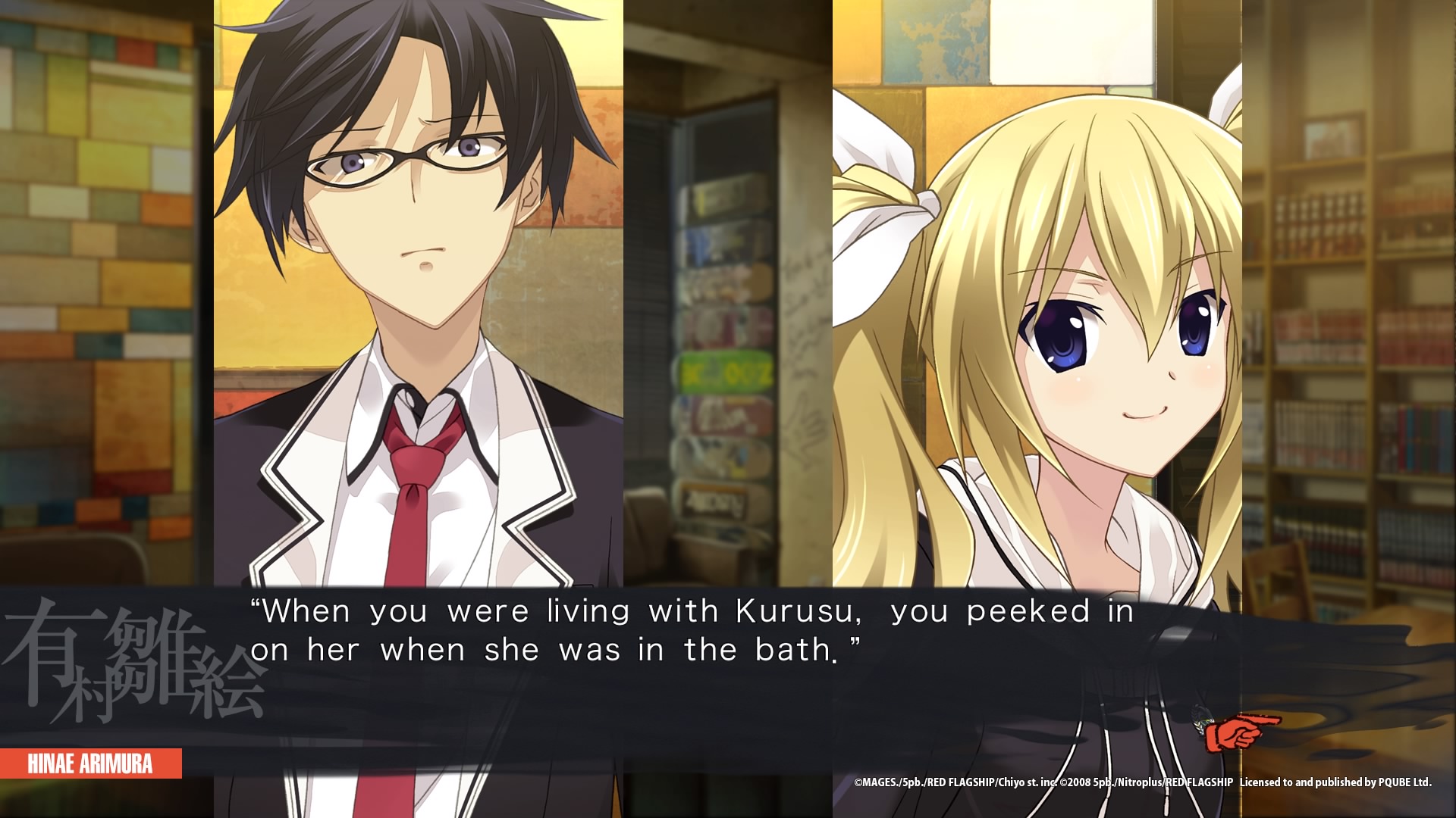 The translation isn’t perfect. There’s several errors scattered throughout the game, mostly incorrect word forms, missing spaces, and unnecessary or missing punctuation. On top of that, there are several cases where the text in the text box is different from what’s shown in-game, such as the chapter titles which include an English title, generally similar but not identical to the localized chapter title, and a Japanese title which translates to something different. There are also some cases where text in the background isn’t translated while it is at other times, as well as two lines of untranslated text at the end of the main route. The errors in particular somewhat break immersion, and a patch to fix them at some point would be appreciated.