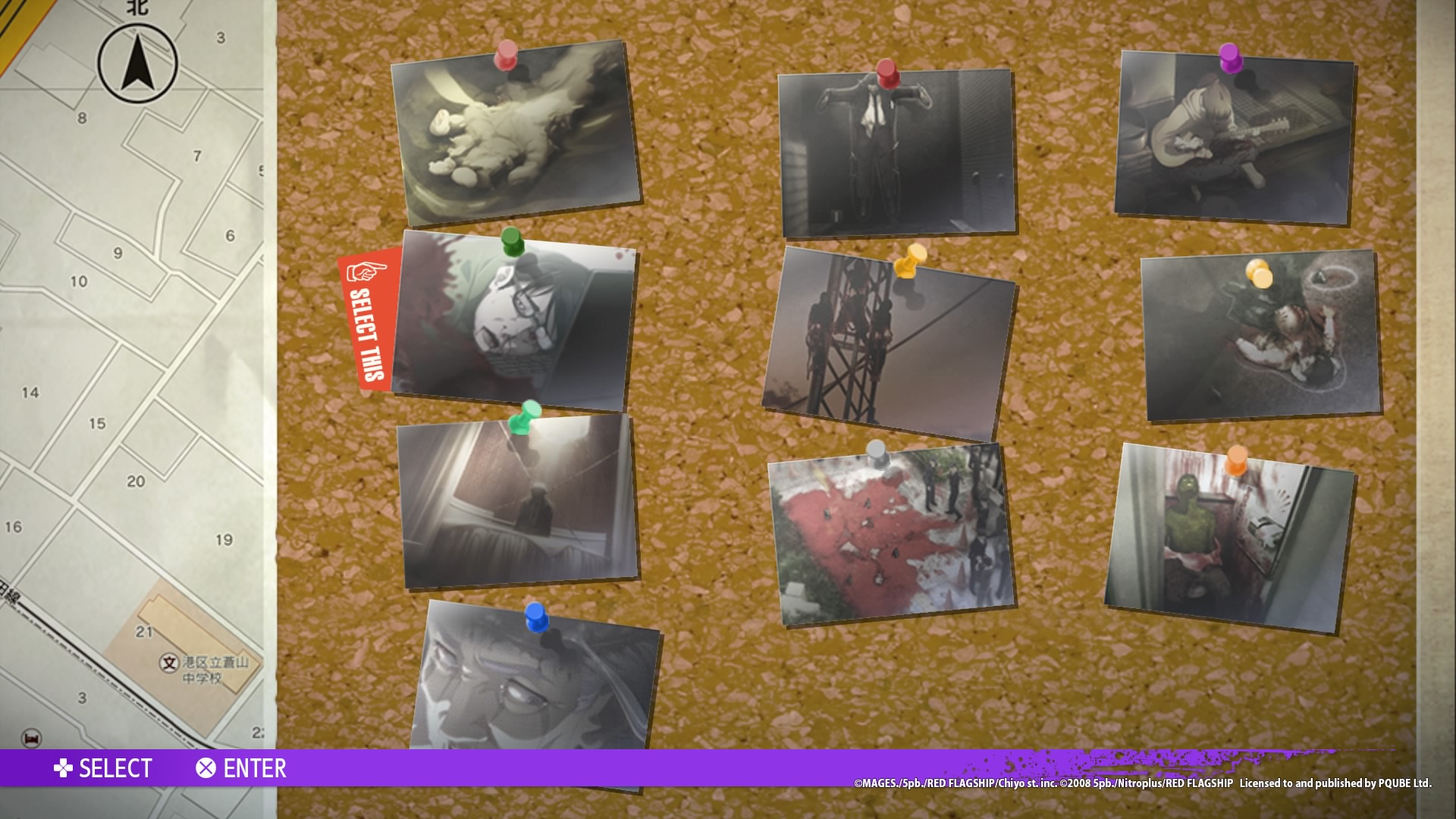 In addition to the Delusion Trigger, Chaos;Child has the Mapping Trigger system, where the player compiles information about the case by attaching photos or notes to specific places on a map of Shibuya. It helps the player recap and keep track of what’s happening, as well as the murders from Chaos;Head. It helps the player feel involved with the mystery and investigation process, more than one might ordinarily if there was only reading. Ultimately the Mapping Trigger isn’t a huge part of the game, but it’s a nice touch regardless.