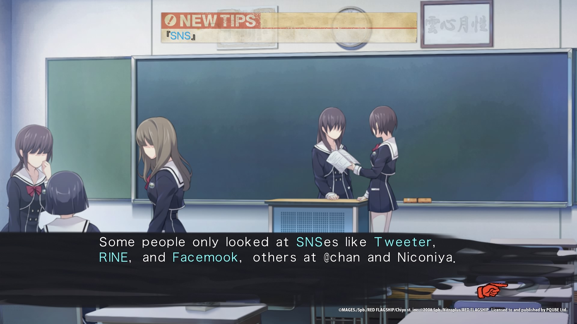 In general, the presentation of Chaos;Child is very impressive and well-done. While the art style is very different from Steins;Gate, the sprites are animated the same way, with the characters’ mouths moving along with their voices as they speak. The art style is similar to Chaos;Head, although somewhat more mundane than the unique style of Steins;Gate. There’s a surprising amount of flexibility in the way the game can set up scenes, with the variety of sizes and positions the sprites can take as well as each character having a back sprite. There’s also the tips list to provide in-universe definitions as well as explanations of things like internet slang, technical details, and other information. There are also some smaller touches, such as the auto-skip remaining active even during unread text, so it can automatically resume skipping once the player gets back to unread text.