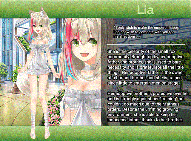 Desiring the comfort of life like other races, the great leaders of the foxes decided to send their vixens to the Great City of Crance, as a gift to the emperor with hope that one of the girls would luck out to be chosen as the emperor’s concubines (or even, mate) and could provide better life for their race. The emperor, after all, has been famed with certain soft spots for his concubines.