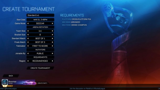Tournament creators can set minimum and maximum thresholds for entry based on a player’s Rank in the related Competitive Playlist