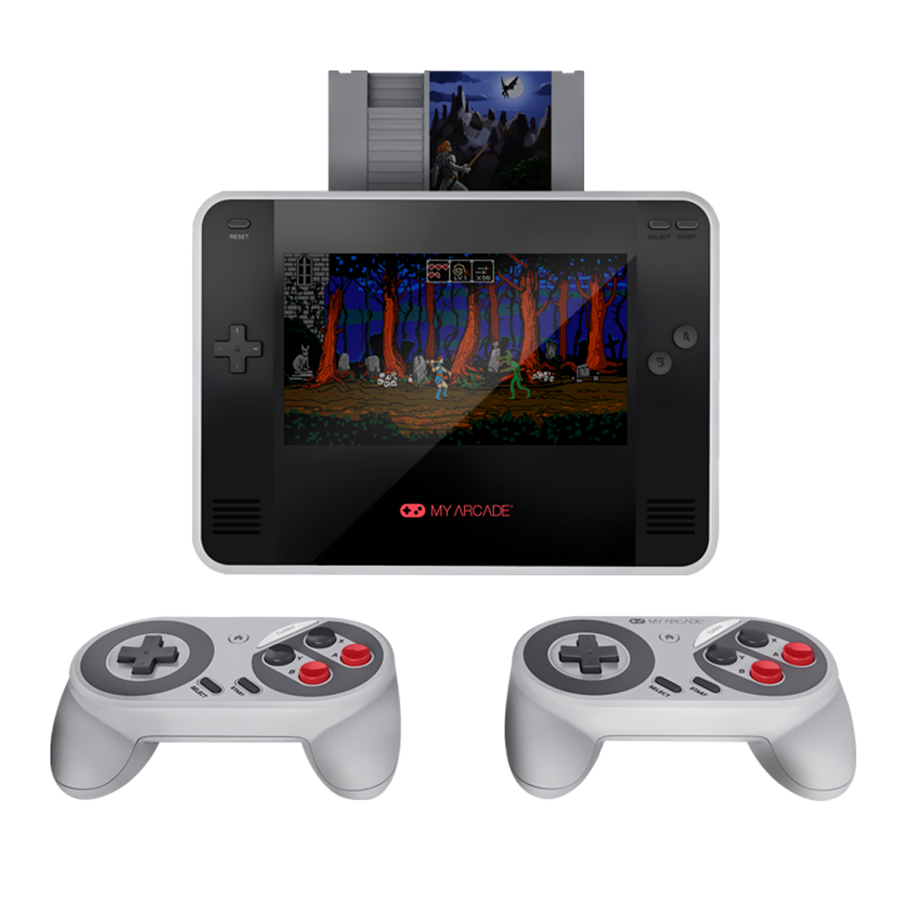 - Retro Champ [MSRP $79.99]: The Retro Champ is My Arcade’s portable console that plays NES and Famicom cartridges and also supports HDMI output for home play. The console boasts a 7” screen, 3-5 hour battery life, and a built-in cartridge cleaning kit.