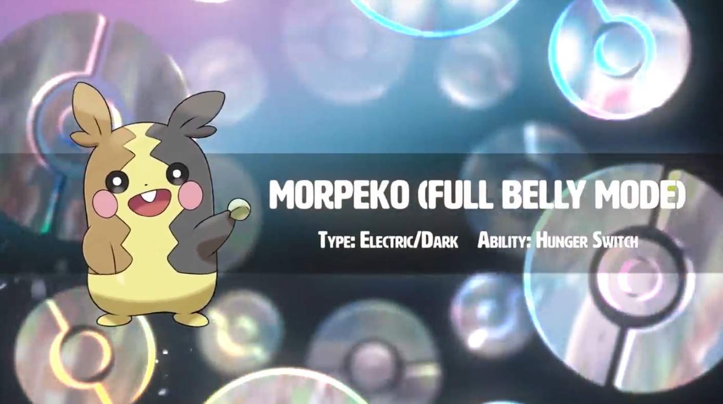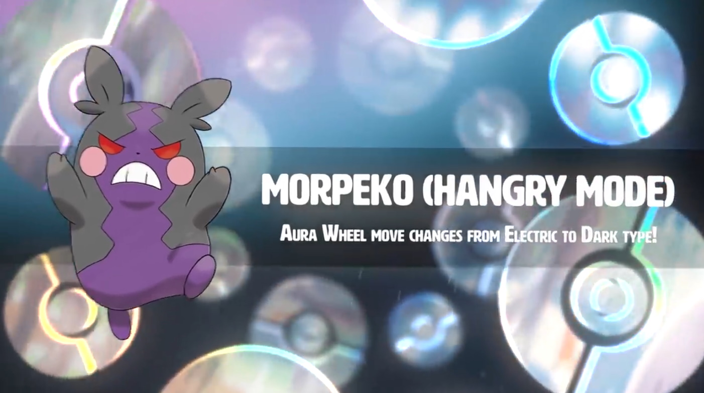 The sacs in Morpeko’s cheeks constantly generate electricity. This consumes energy, causing Morpeko to be constantly hungry. To satisfy this hunger, Morpeko always carries around Berry seeds to snack on. When experiencing prolonged hunger, Morpeko’s hormone balance changes. This causes its fur to change colors and triggers more aggressive and volatile behavior. The energy stored in its cheek sacs also changes from Electric type to Dark type. Morpeko’s Ability, Hunger Switch, is a new Ability that causes it to change its appearance each turn. Aura Wheel is Morpeko’s signature move, and it changes type depending on Morpeko’s form. In Full Belly Mode, the move is Electric type. In Hangry Mode, the move becomes Dark type.