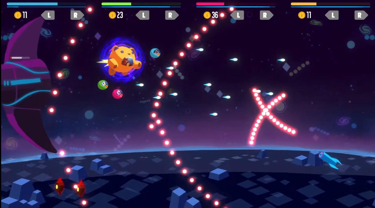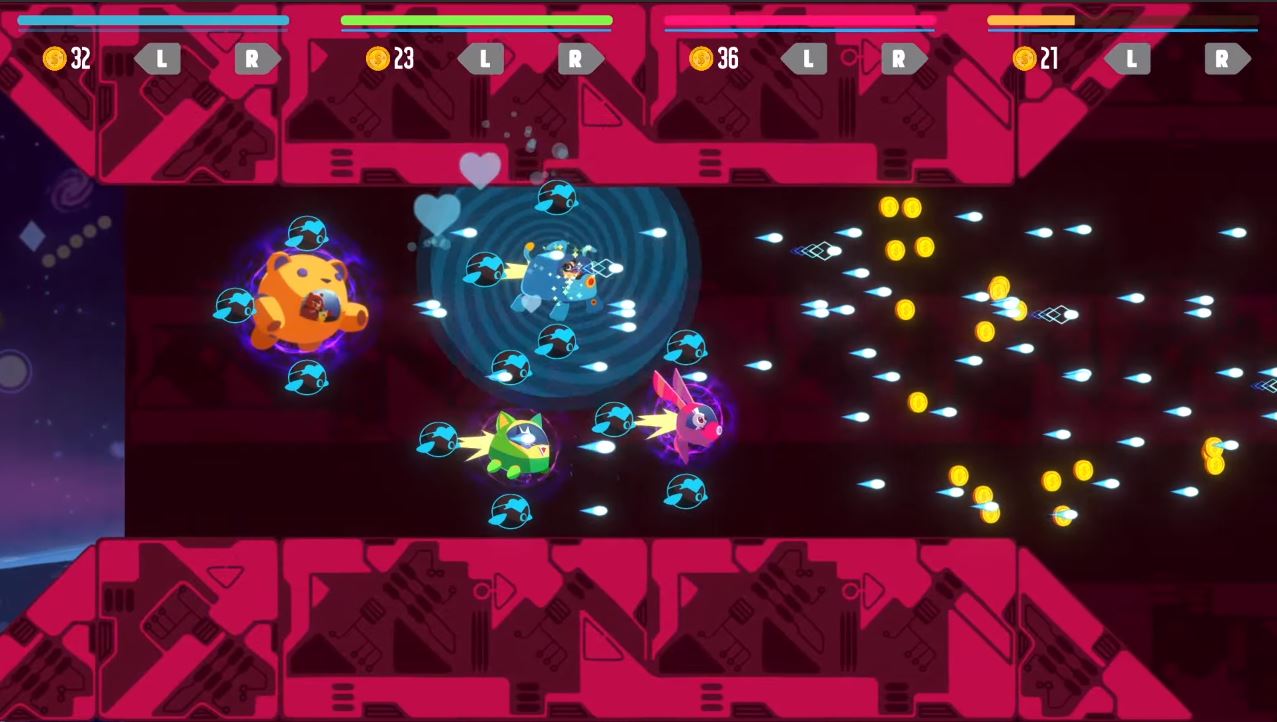 Bark: This is a couch focused co-op side-scrolling shooter where the players shoot up robot bad guys as cute, spaceship piloting animals, each with a unique playstyle and abilities.